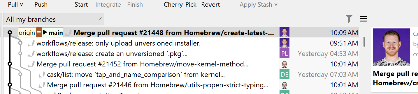 SmartGit supports signed commits by visually indicating their presence in the commit graph: when a cryptographic signature exists, a subtle grey pen icon appears to the left of the commit, signaling that the commit is signed.
